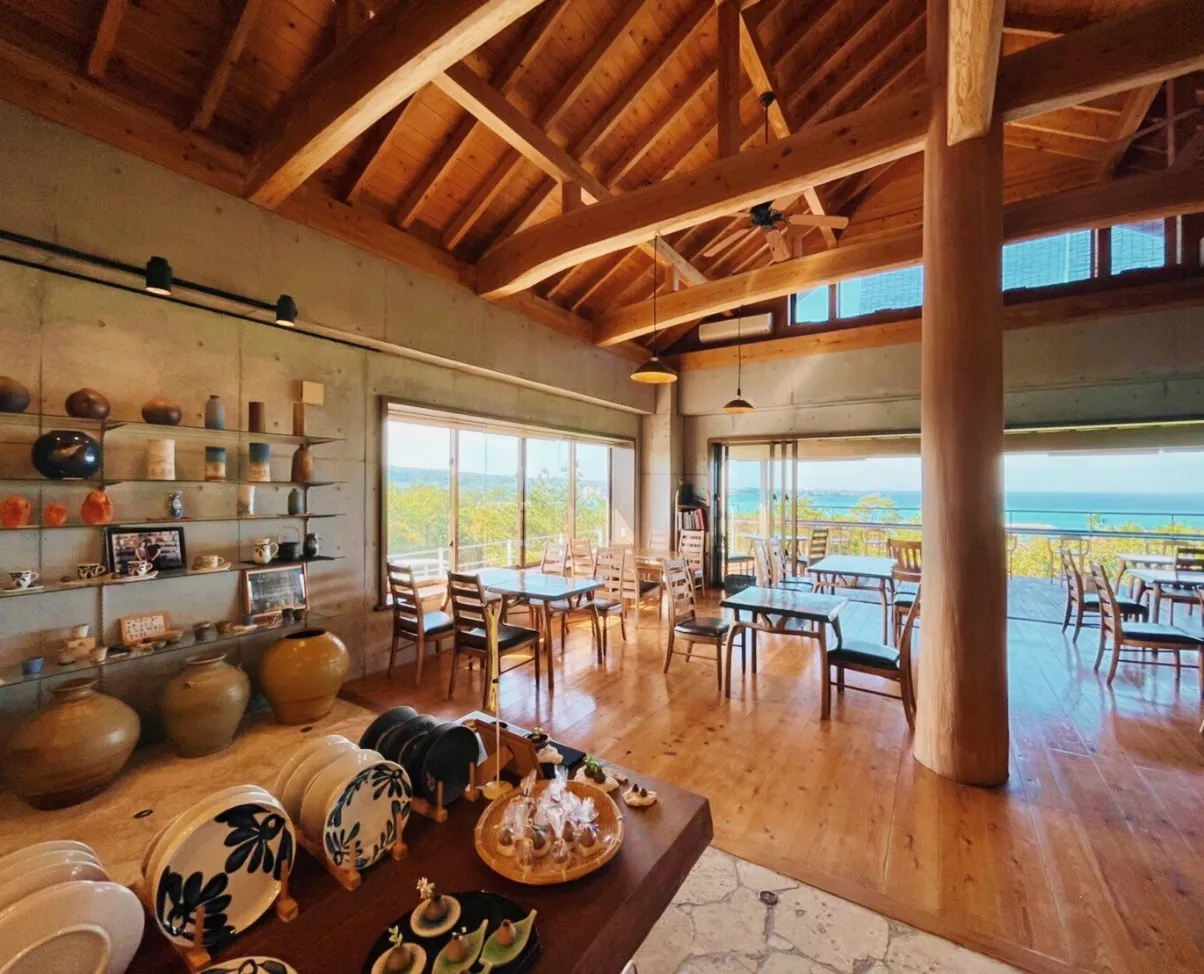 恩納村の海が見渡せる、見晴らし抜群のカフェです。 時間ごとに変化する絶景を目の前で、玉田彰の作る器でピザやスイーツをお楽しみいただけます。