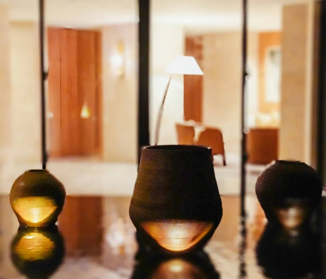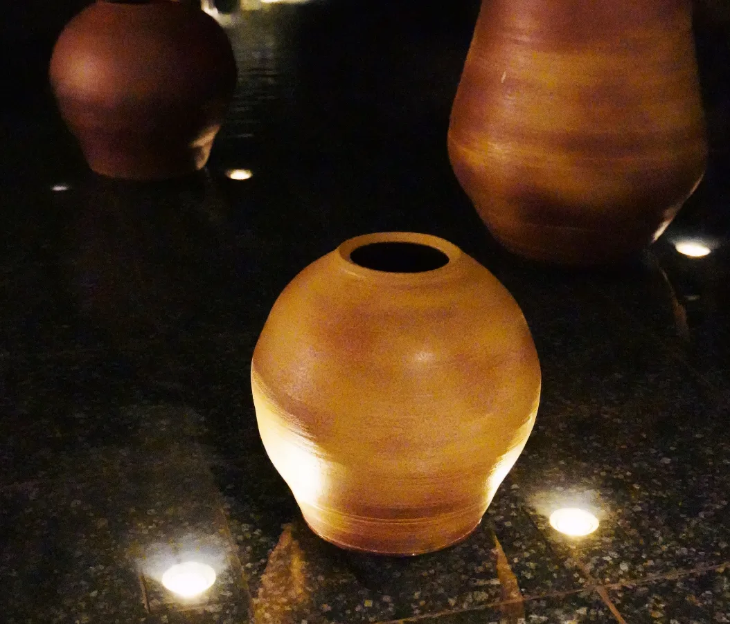 沖縄ハレクラニホテルのエントランスを彩る大壺群。テーマは「沖縄の光と風」。陽光を映す釉薬の輝きと、風を受けて生まれた曲線が調和し、訪れる人を包み込むように迎え入れます。
