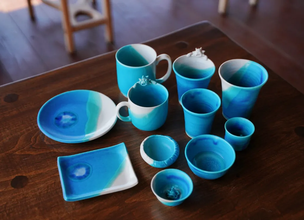 沖縄サミットの晩餐会で使用された器をはじめ、ホテルやレストラン、カフェなど、さまざまな場で使われています。料理や空間を引き立てる存在として、日々の営みの中に静かに息づいています。
